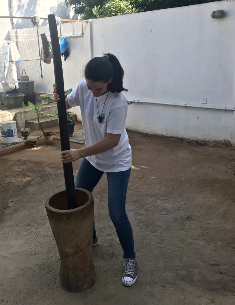 Um prato muito típico é a chima (tem um aspeto semelhante ao puré de batata, ainda que mais consistente, e é feito com farinha de milho). Matapa é um acompanhamento bastante cozinhado por todo o Moçambique e consoante a região é confecionada de maneira diferente (certo é que é feita com folhas da mandioca e leite de côco). Não só provámos como ajudámos a pilar molina (amendoim torrado, farinha de mandioca e açúcar), deliciosa! Este país premeia-nos também com castanhas de caju maravilhosas e verdadeira fruta (papaias, mangas, pera abacate, bananas, côco…).